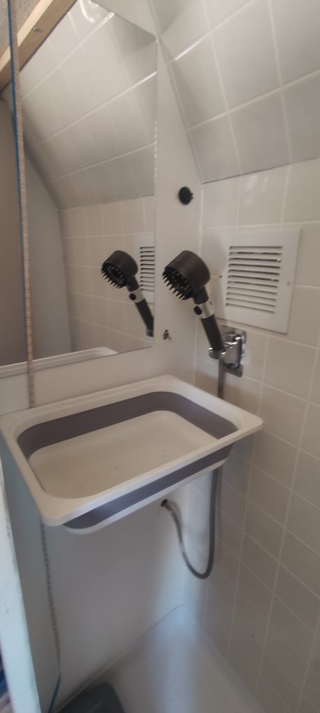 Das fehlende Teil für die Wasseranlage hat ich in einer Kiste. Ich suchte einen Adapter (1/2″ female auf 1/2″ female). Rechtzeitig viel mir ein, dass ich dafür einen reserve Duschschlauch verwenden kann.
