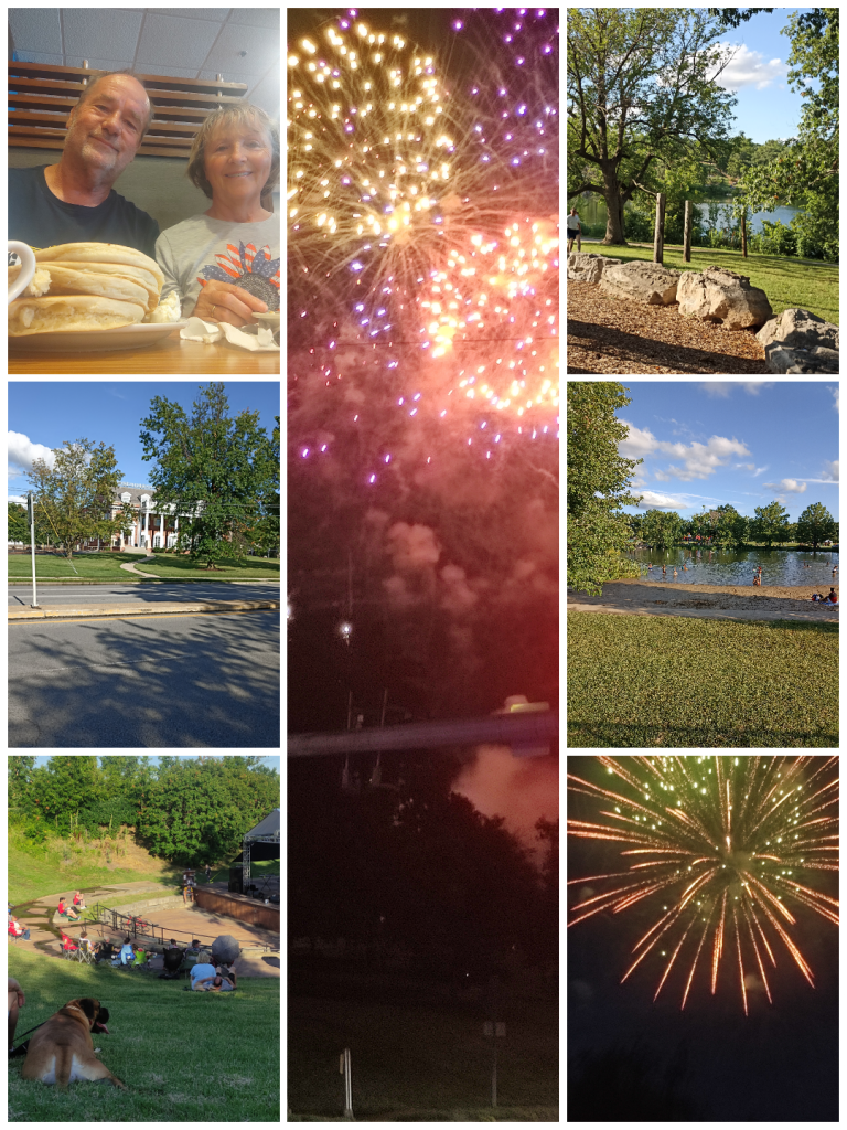 Morgens hört der Regen auf. Wir machen einen schönen Spaziergang um einer See. Nach ein Paar Miles sehen wir ein iHOP (Inertnational Hous of Pancake). Zwischendurch regnet es schon mal. Die 100 Meilen schaffen wir ruck zug. Kurz nach 12 sind wir in Columbia (Missouri) … und finden Mitte in der Stadt ein geeignetes Plätzchen (am 4. July ist (noch) alles ausgestorben..)